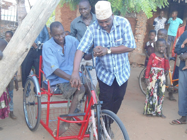 akimkabidhi baikeli mkazi wa Mtaa wa Tongoni Jijini Tanga,Mwinchumu Ally jana ambaye anamatatizo ya ulemavu wa miguu kwa ajili ya kutembelea ikiwa ni kutimiza ahada aliyomuahaidi wakati wa kampeni za uchaguzi mkuu mwaka