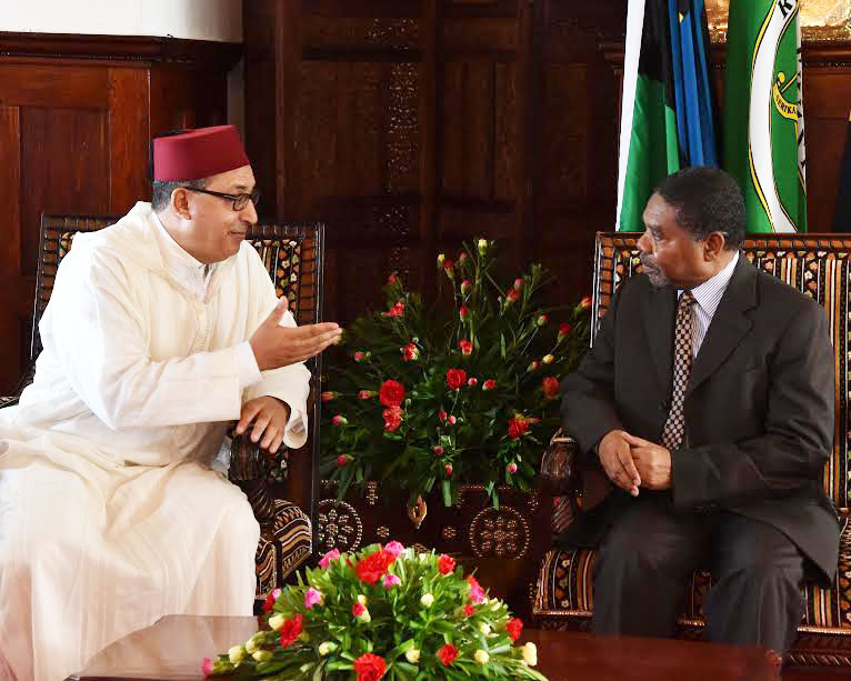 Rais wa Zanzibar na Mwenyekiti wa Baraza la Mapinduzi DK.Ali Mohamed Shein akisalimiana na mgeni wake Balozi wa Morocco katika Jamhuri ya Muungano wa Tanzania Mhe,Abdelilah Benryane wakati alipofika Ikulu Mjini Zanzibar leo.