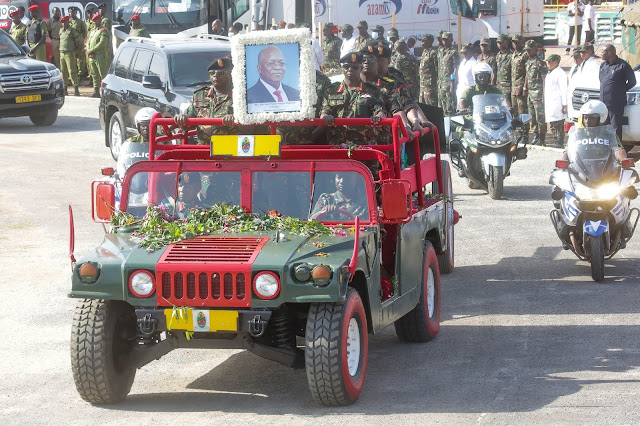 Mwili wa hayati Dkt. John Pombe Magufuli, ukiwasili kwenye uwanja wa CCM Kirumba, jijini Mwanza kwa ajili ya tukio la kuagwa na wananchi wa Mwanza, Machi 24, 2021.