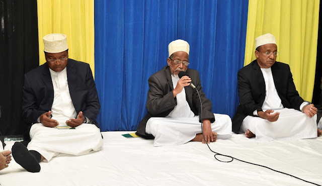Sheikh Mkuu wa Mkoa wa Dar es Salaam Alhadi Mussa akipika fatha kabla ya kuaza kwa Kisoma Maalum kumsomea Hayati Rais wa Kwanza wa Zanzibar na Mwenyekiti wa Baraza la Mapinduzi Abeid Amani Karume kilichofanyika katika ukumbi wa Afisi Kuu ya CCM Kisiwandui Jijini Zanzibar leo 7-4-2021.