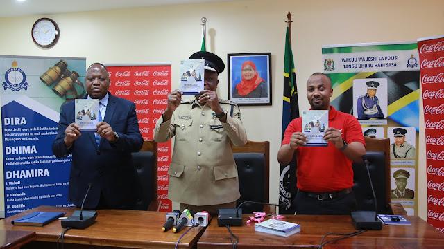 Mkuu wa Jeshi la Polisi nchini IGP Simon Sirro (katikati) akionesha baadhi ya nakala za vitabu vya mwongozo wa kuzuia na kufichua uhalifu katika Kata/Shehia kutoka kwa Mkurugenzi wa Mawasiliano ya Jamii wa Kampuni ya vinywaji ya Coca Cola, Salum Nassoro, ambapo jumla ya nakala 2000 zilichapishwa na kukabidhiwa kwa Jeshi hilo kupitia ufadhili wa kampuni hiyo ya vinywaji, kushoto ni Mkurugenzi wa Upelelezi wa Makosa ya Jinai DCI Robert Boaz, hafla hiyo imefanyika leo jijini Dar es salaam.