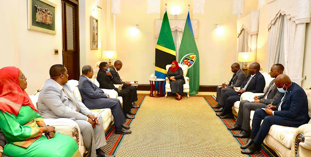 Rais wa Jamhuri ya Muungano wa Tanzania Mhe. Samia Suluhu Hassan, akizungumza na Mwenyekiti wa Kikosi Kazi cha kuratibu maoni ya wadau wa Demokrasia ya Vyama vingi vya Siasa Profesa Rwekaza Mukandala aliyeambatana na baadhi ya Wajumbe wa Kikosi kazi hicho Ikulu Jijini Dar es Salaam leo 30 Mei, 2022.