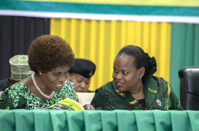 Naibu Katibu Mkuu wa Chama Cha Mapinduzi (Bara) Ndugu Christina Mndeme akiteta jambo na Kamisaa wa Sensa ya Watu na Makazi, Spika Mstaafu wa Bunge la Jamhuri ya Muungano wa Tanzania Mhe. Anne Makinda wakati wa ufunguzi wa mafunzo kwa Viongozi wa matawi na mashina waliochaguliwa 2022 katika ukumbi wa mikutano wa kimataifa wa Jakaya Kikwete Convention.