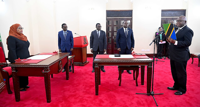 Rais wa Jamhuri ya Muungano wa Tanzania Mhe. Samia Suluhu Hassan akimuapisha Dkt. Kassim Mohamed Khamis kuwa Balozi kwenye hafla fupi iliyofanyika Ikulu Chamwino Mkoani Dodoma tarehe 16 Juni, 2023.